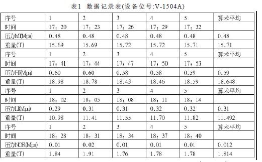 K1=(操作壓力下顯示重量-常壓下顯示重量)/(操作壓力常壓)式中,重量單位噸( T),壓力單位兆帕(MPa), K 1=(18.648-1.814)/(0.59-0.012)=16.834/0.578=29.1246。
