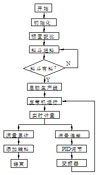當系統(tǒng)開始工作時,啟動配料生產(chǎn)線。首先系統(tǒng)程序進行初始化,通過上位機或觸摸屏設置配料配比,檢查料斗有無物料。若無物料,向料斗送料,啟動配料生產(chǎn)線,由電子皮帶秤進行稱重并實時計量,CPU計算得實時流量及累計流量。若設定流量與實際流量有偏差,調(diào)節(jié)器根據(jù)系統(tǒng)控制要求比較設定值與實際流量的偏差,經(jīng)PID調(diào)節(jié)改變輸出信號以控制變頻器對輸送電機的速度調(diào)節(jié),從而實現(xiàn)恒流量控制。根據(jù)配比各輔料同時混合計量,并按配方工藝要求添加。系統(tǒng)主程序控制流程如圖3。