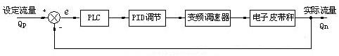 該自動配料系統(tǒng)由5臺電子皮帶秤配料線組成,編號分別為1#、2#、3# 、4#、5#、,其中1#~4#為一組,1#為主料秤,其余三臺為輔料秤。當不需要添加輔料時,5#電子秤單獨工作輸送主料。系統(tǒng)具有恒流量和配比控制兩種功能。對于恒流量控制時,電子皮帶秤根據(jù)皮帶上物料的多少自動調(diào)節(jié)皮帶速度,以達到所設定流量要求。以主秤(1#)系統(tǒng)工藝流程來分析,工藝流程如圖1所示。