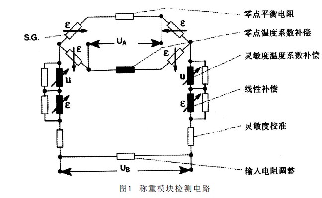 如圖1 所示, 檢測電路的功能是把電阻應變片的電阻變化轉變?yōu)殡妷狠敵?。在所加橋壓U 不變的情況下, 傳感器輸出信號與作用在傳感器上的重力和供橋橋壓成正比, 而且, 供橋橋壓U 的變化直接影響電子稱的測量精度, 所以要求橋壓很穩(wěn)定。因為惠斯登電橋具有很多優(yōu)點, 如可以抑制溫度變化的影響, 可以抑制側向力干擾, 可以比較方便的解決稱重模塊的補償問題等, 所以惠斯登電橋在稱重模塊中得到了廣泛的應用。因為全橋式等臂電橋的靈敏度較高, 各臂參數(shù)一致,各種干擾的影響容易相互抵銷, 所以稱重模塊均采用全橋式等臂電橋。