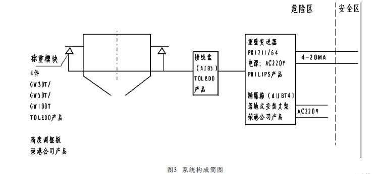 料罐底部的稱重模塊將料罐的重量信號傳至接線盒。接線盒中并聯(lián)各路稱重模塊信號, 并可根據(jù)各稱重模塊受載情況調節(jié)角差, 經(jīng)過匯集后的重量信號送至重量變送器。重量變送器將重量信號處理成相應的重量數(shù)據(jù)輸出至控制系統(tǒng)。