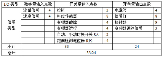 系統(tǒng)中主、輔料秤由可編程控制器(PLC)和上位機實現(xiàn)兩級控制?,F(xiàn)以1#~4#四臺電子皮帶秤的PLC控制分析為例,每一電子皮帶秤有一臺皮帶驅(qū)動電機,兩個料位傳感器,一個速度傳感器,一個稱重傳感器,一臺變頻器,它們構(gòu)成了被控對象。電動機的啟、停由開關量控制,PLC數(shù)字量輸出信號作為變頻器的控制端輸入信號,經(jīng)變頻器調(diào)制輸出高頻脈沖給皮帶驅(qū)動電機。料位傳感器檢測料斗有無物料,速度傳感器測量電機的轉(zhuǎn)速。系統(tǒng)需8個數(shù)字量輸入信號,25個開關量輸入信號和24個開關量輸出信號,I/O點總數(shù)量為57。I/O點數(shù)量和類型如表1所示。